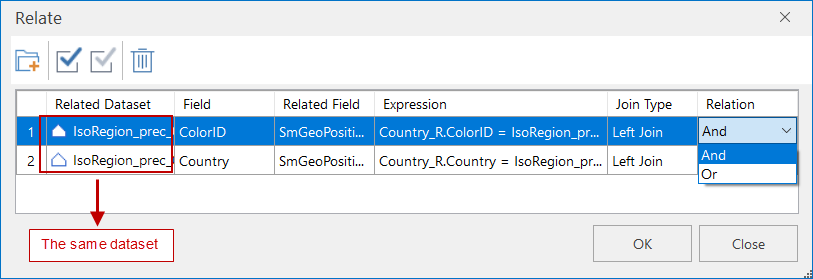 - Expression: Displays the join condition between the source dataset properties table and the related attribute table. After setting the field, join field, and other information, the join condition is automatically generated.