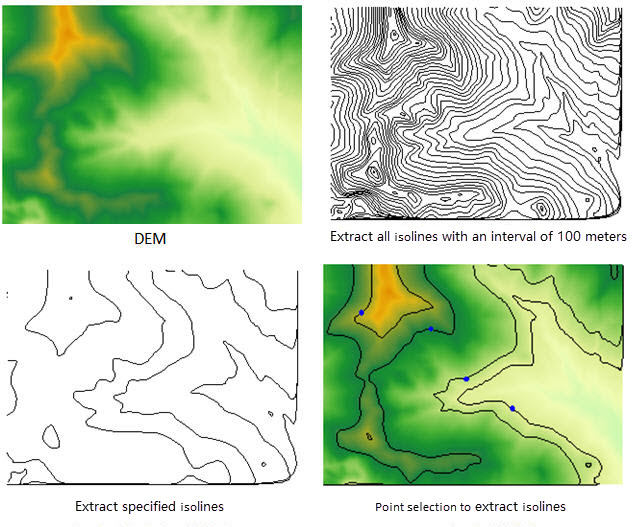 SuperMap supports extracting contour lines from raster datasets via surface analysis. Three extraction methods are available: extract all isolines, extract specific isolines, and isolines from click.