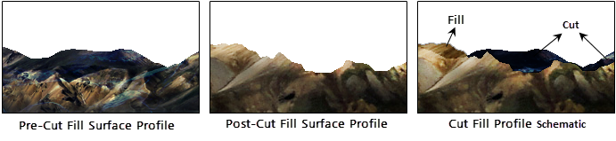 Surface cut fill quantifies material movement due to erosion or deposition, where "cut" denotes removal and "fill" denotes addition. It calculates the area and volume needed to transform one state to another, as shown in the terrain profile below.