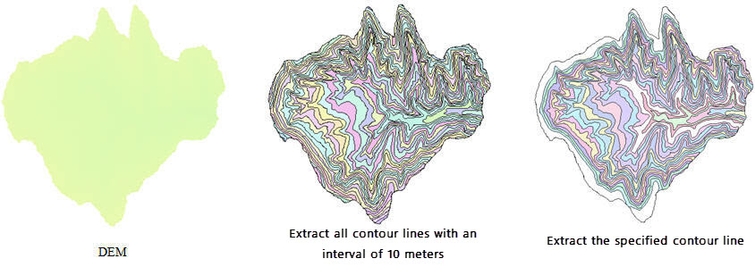 The contour interval is the spacing between adjacent contour lines. Together with the base value, it determines which contour lines are extracted. For instance, with a base value of 0 and a contour interval of 50, for DEM raster data with an elevation range of 120-999, the minimum contour extracted is 150, the maximum is 950, resulting in 17 contour lines.