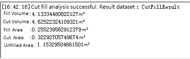 Fill Volume (cubic meters), Cut Volume (cubic meters), Fill Area (square meters), Cut Area (square meters), and Unchanged Area. Example: