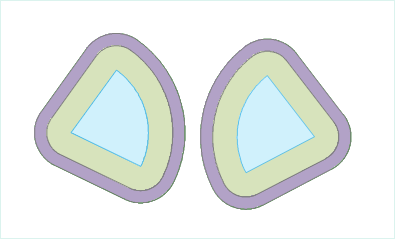 Figure 1: Multiple ring buffer results Figure 2: A group of merged buffers - Generate ring-buffer: Check this option to create multi-buffers where the outer buffer is adjacent to the inner data as a ring-shaped area. Unchecking it makes the outer buffer an area that includes the inner data. This is checked by default.