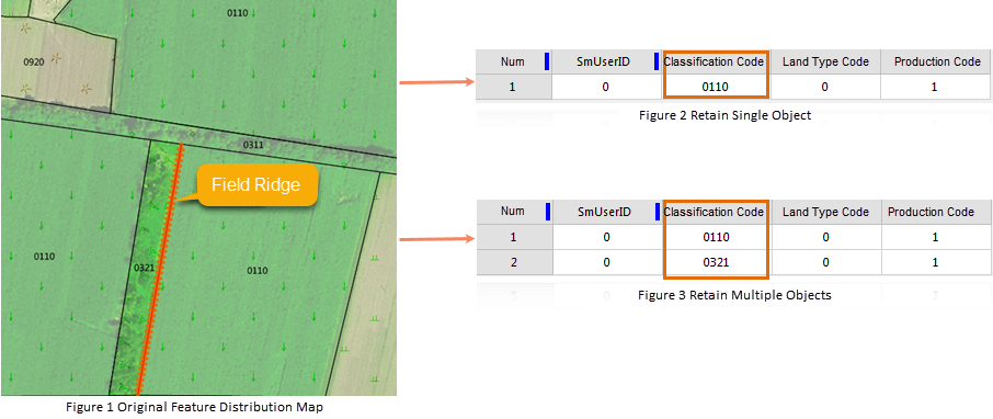 For example: Taking Figure 1 below as an example, the field ridge is at the boundary of two patches with classification codes 0321 and 0110. Now, to calculate the net area of the patches, first calculate the patch area, then deduct the area of the linear field ridge. The linear field ridge is on the edge of the patch, and its area is only deducted by half. Through the intersection operation, if 'Single Object' is checked, the result field ridge belongs to only one patch as shown in Figure 2. If not checked, the result retains both line objects as shown in Figure 3. Then, by specifying the patch ID, deduct the polyline area in the corresponding patch to obtain the net area result.