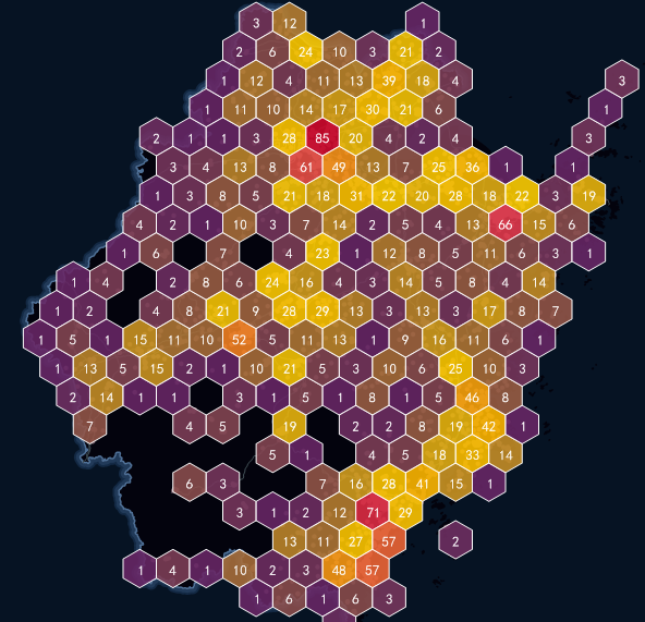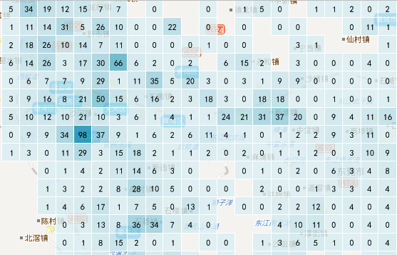 Grid maps excel in quantifying spatial distributions compared to heatmaps. The example below demonstrates tourism attraction distribution in Zhejiang Province using grid mapping.
