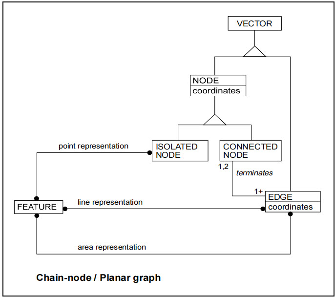Topological Structure: Charts adopt chain-node topology, which includes three types of spatial objects: isolated nodes, connected nodes, and edges. This topology describes how feature objects reference spatial objects to determine their spatial information. For example, point objects may reference isolated or connected nodes; line objects reference edges and sequences of connected nodes; polygon objects reference closed edge loops.