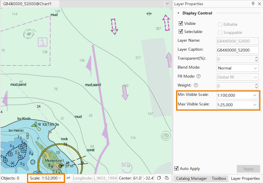 - When chart groups are loaded, each group displays as a layer. The Display Control section in Layer Properties shows default scale values derived from DataCoverage dataset fields.