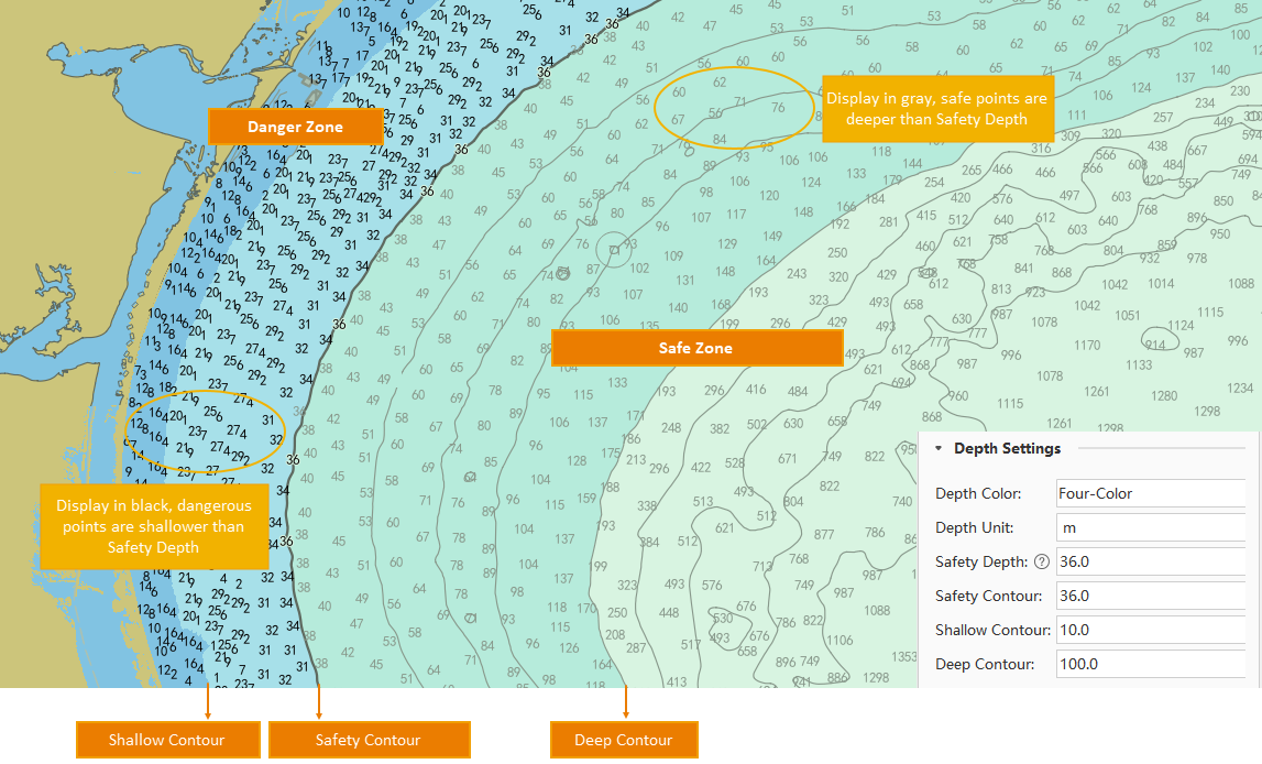 Displayed in the lightest blue, these zones represent optimal navigation areas. Mariners can adjust this value according to specific needs, such as setting it to the maximum safe anchoring depth.