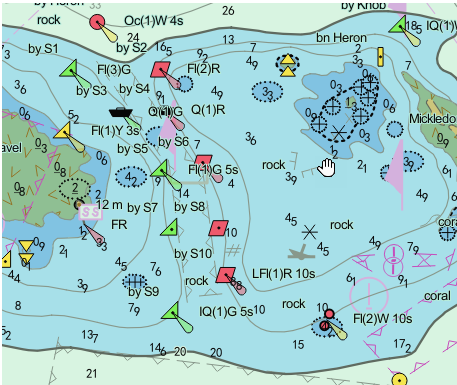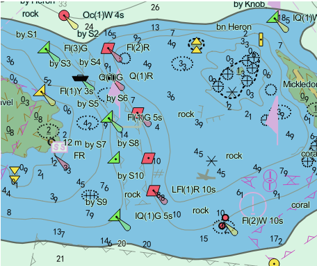 As shown in Figure 3, safety contours are highlighted with thick lines. The lighter-shaded side indicates safe passage areas, while the darker side marks hazardous zones. This distinction remains vital in both two-color (Figure 2) and four-color displays (Figure 1).