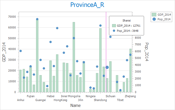 Example: Creating a 2014 GDP vs Population composite chart: Set GDP_2014 as Y1 (Column), Pop_2014 as Y2 (Scatter). Result shown below: