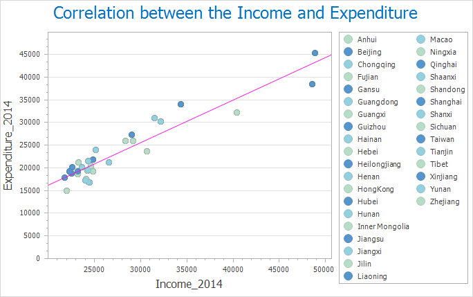 Example: National city income vs expenditure scatter plot: Income (X), Expenditure (Y), Province (Group). Result shown below: