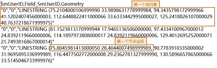 - Line: Coordinate information for line objects is stored in the Geometry field as "LINESTRING()", containing nodes from start to end within the parentheses. X/Y coordinates are separated by spaces, and nodes are separated by commas. Example: