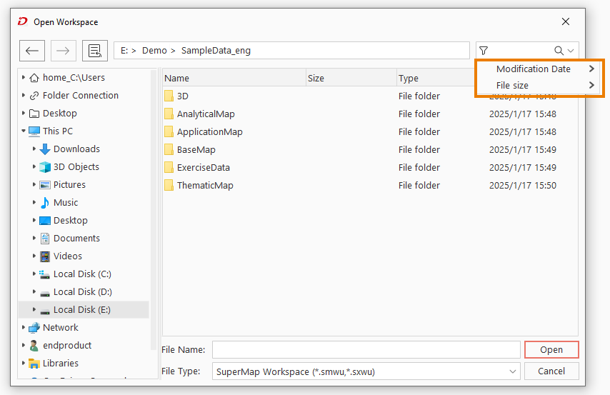The File Selector is used in various scenarios such as opening a workspace, opening a datasource, or opening a file. It supports filtering files by keyword search, modification date, or file size to improve search efficiency.