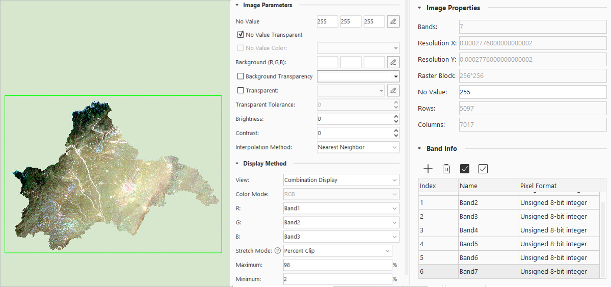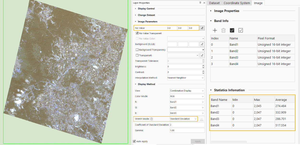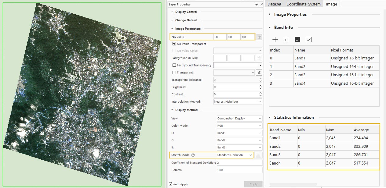 Image minimum-maximum stretching, standard deviation stretching, and Gaussian stretching display require image statistical data. If the image does not have statistical data, the program will prompt you to compute it. If the image is missing No-Value or has incorrect No-Value information, it will result in erroneous computation.