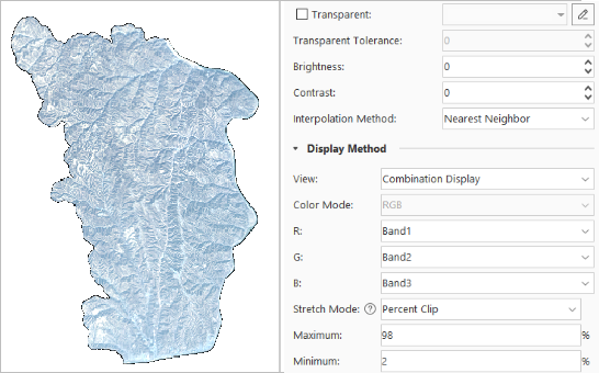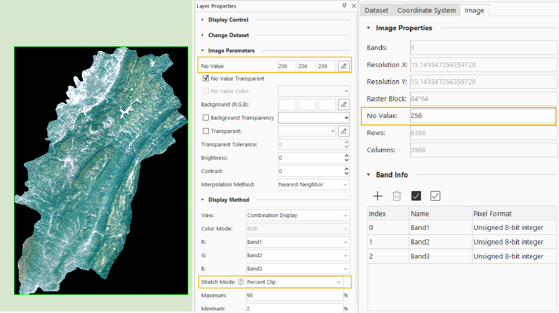 - Reopen the mosaic dataset map to correctly display the stretch effect, but you will need to manually modify the image layer's “no-value (RGB)” to the correct value of 0 for the no-value region to be displayed transparently.