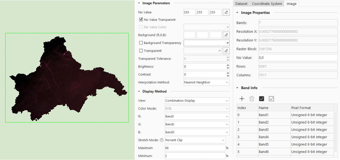 After introducing mosaic dataset No-Value, if you enable the mosaic dataset No-Value, the generated overview image file (.tif) will contain No-Value information (Figure 3-5), allowing the correct display after stretching.