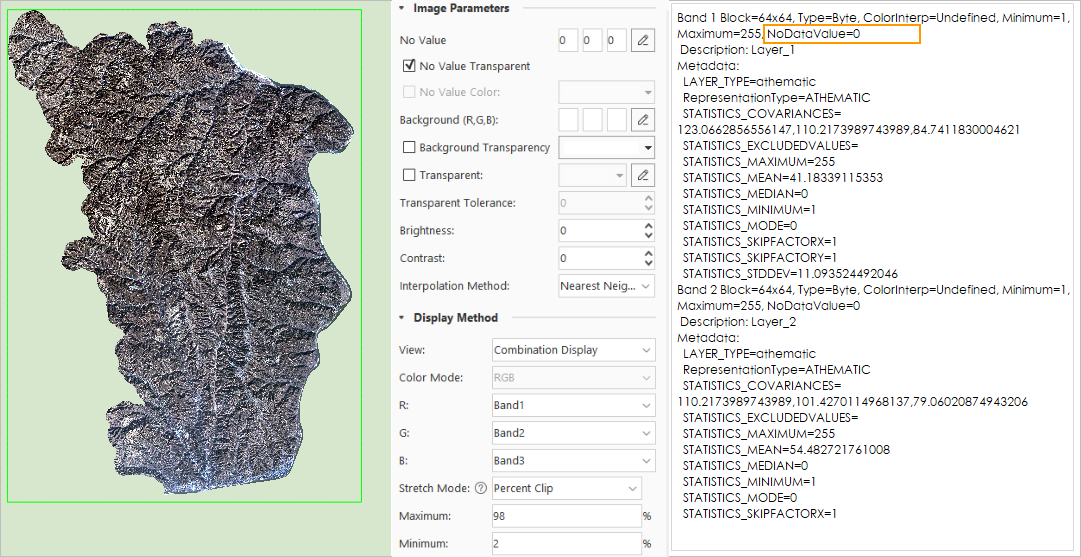 This happens because when generating the overview, if mosaic dataset No-Value is not enabled, the generated overview image file (.tif) will not contain No-Value information (Figure 3-4), resulting in the statistical data of the overview image not excluding the No-Value area during stretching, leading to abnormal display.