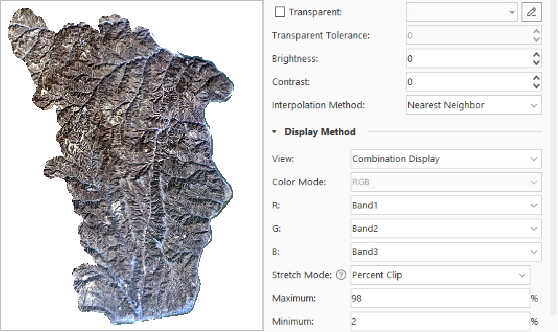 - You can also reopen the mosaic dataset, adjust the stretching method, and the image will be correctly displayed with no-value areas by default shown transparently.
