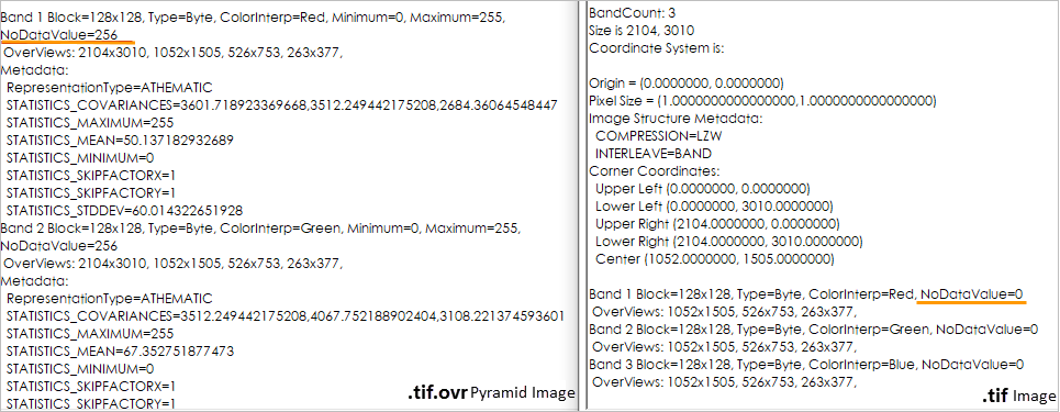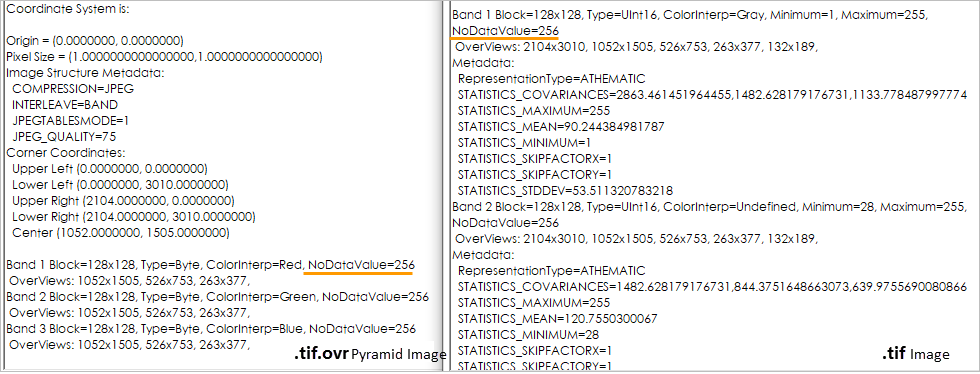 Image pyramids are constructed based on the original image file, such as a .tif image file, with its image pyramid file being .tif.ovr. The .tif.ovr is also an image file. When the original image file has the aforementioned issues such as missing No-Value information or incorrect No-Value information, the created .tif.ovr image pyramid will have the same issues. These pyramid image issues cannot be resolved by enabling mosaic dataset No-Value and recalculating statistical data; they must be resolved by using the mosaic dataset to recreate the image pyramid.
