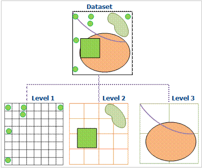 The data is organized and managed by dividing the data into multi-layer grids. The basic method of Dynamic Index is to divide the Dataset into equal or unequal grids according to certain rules, and record the grid position occupied by each geographic object. Regular grid is commonly used in GIS. When the user performs Spatial Query, the grid where the user query object is located is first calculated, and the selected geographic object is quickly queried through the grid. Query operations can be optimized. As shown in the figure: