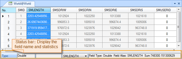 - Click Table tab->Statistics->Sum, or right-click and select Statistics->Sum. The calculation results including column type, field name, and total sum will display in both the status bar and output window.