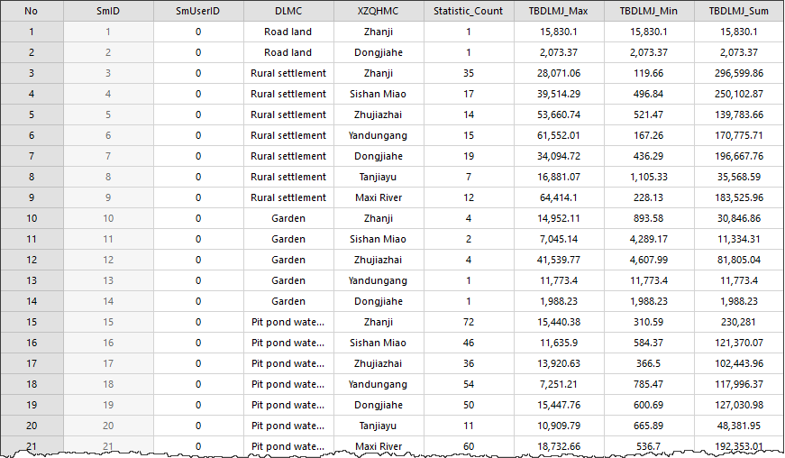 Multiple summary types can be set simultaneously for comprehensive statistical analysis. The output remains in tabular format for convenient export to Excel or other applications. For example, when summarizing land use data requiring statistics on slope, land quality classification, cultivated land, and construction land areas, this feature eliminates repetitive setup and delivers results efficiently.