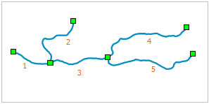 The following figure shows a schematic diagram of a river segment. Using autoconnect functionality, individual line objects can be connected at endpoint snaps (green squares) as numbered, forming a new object during digitization.