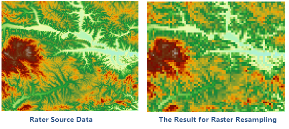 Assigns the cell values or derived values of the original raster dataset to the cells of the newly generated raster dataset, while also changing the resolution of the raster dataset.