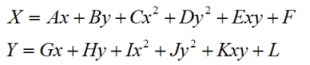 Quadratic polynomial registration is a high-precision method that treats original image distortion as a curved surface while outputting to a regular plane. Theoretically, any surface can be approximated by sufficiently high-order polynomials. A quadratic polynomial can effectively correct severely distorted images with high accuracy. The correction formula is: