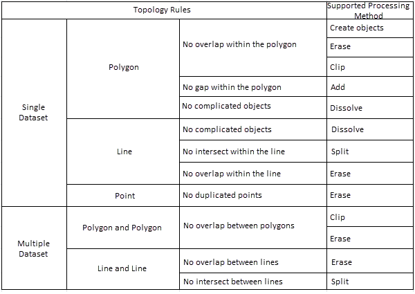 The support status of interactive topology processing for datasets and topology rules is shown in the following table: