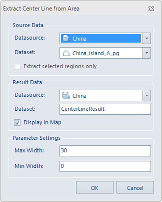 - Minimum Width: The minimum width between polygon boundaries (≥0) for centerline extraction. Areas narrower than this value will not generate centerlines. Default is 0 (same unit as source dataset). Minimum width must be less than maximum width.