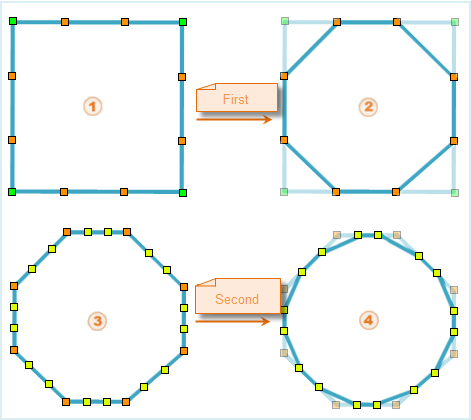 The Corner-rounding method is computationally simpler and faster, but with limited effectiveness. It trisects original segments by inserting two points, then connects adjacent inserted points to round sharp corners. Each complete process constitutes one rounding iteration.