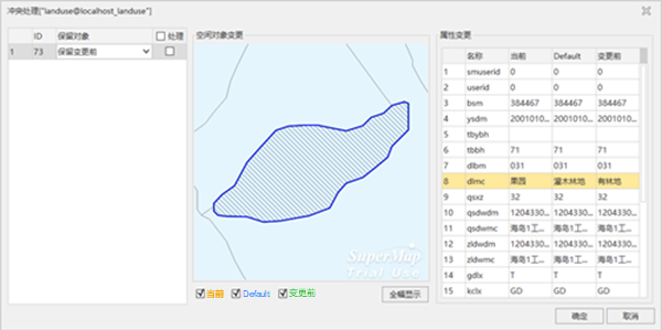 - Update the changes from version V_2 to the Default version, which will trigger a prompt like "Datasource 'localhost_landuse' update completed. Conflicting objects detected, do you want to resolve?" Click the "Yes" button to enter the conflict resolution dialog.