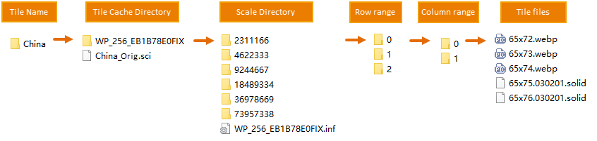 - Tile cache directory: Consists of two components - index file (*.sci) and tile data folder. When opening tiles, only the *.sci file needs to be accessed, which references tile information from the data folder.