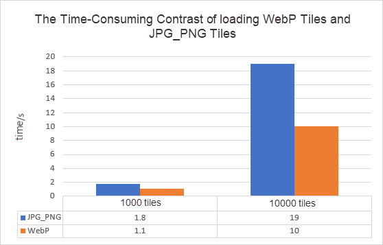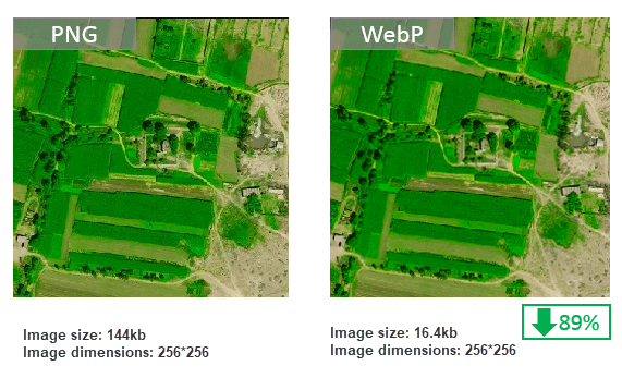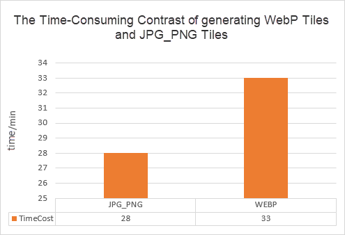 WebP encoding time is "8 times longer than JPEG format". Consequently, generating raster tiles in WebP format requires more time compared to other formats under identical conditions.