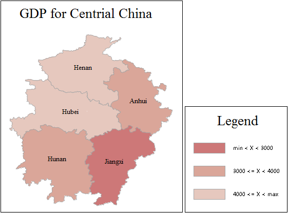 Click the "Thematic Map" tab's "Graduated Color Thematic Map" button to generate a default map. Users can then modify parameters to create customized graduated color thematic maps. The illustration below shows a sample map created using 2000 GDP data from five provinces: Henan (5137), Hubei (3028), Hunan (4276), Jiangxi (2003), and Anhui (3691). The GDP values are divided into three ranges: minimum~3000, 3000~4000, and 4000~maximum, each represented by distinct colors.