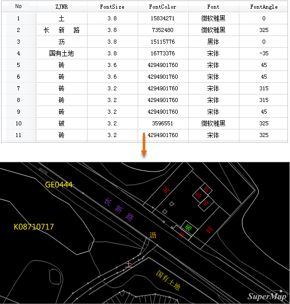 Custom labels enable diversified display of label styles (font, size, rotation angle, color) for different feature types within the same thematic layer. For example, after importing CAD data, creating custom label thematic maps for point datasets containing text can achieve identical display effects to those in CAD. The following figure demonstrates custom label display effects for point data from imported CAD files. Note: Point, line, and region datasets all support custom labels, but line datasets do not support label-along-line functionality. Field-specified controls for font, text size, rotation angle, text color, and offset settings are only effective for point label thematic maps.