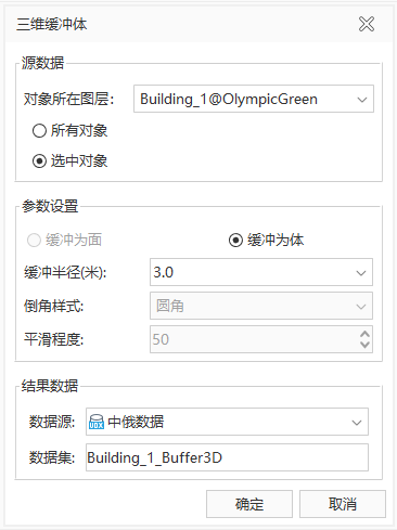 - After setting the above parameters, click the "OK" button to execute the 3D Buffer operation and generate a Model Dataest named after the specified Dataset Name under the specified Result Datasource.