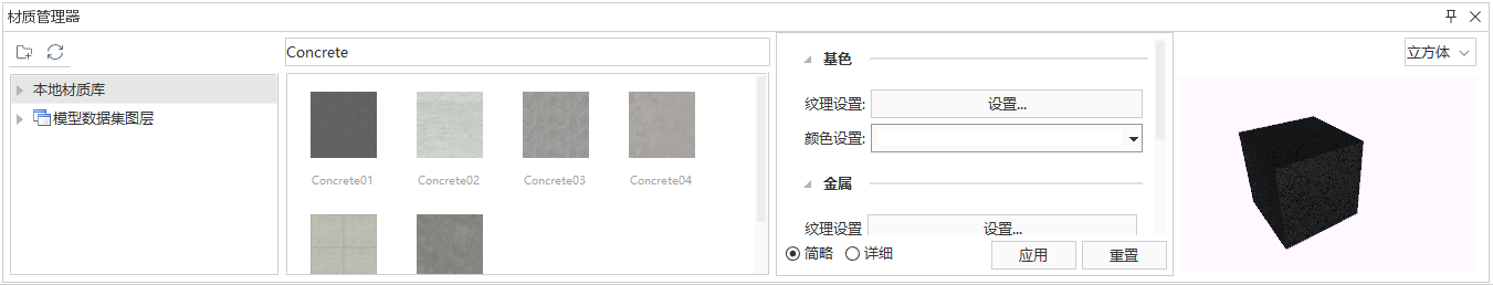 - The material library list displays the local material library, which provides built-in PBR materials such as Concrete, Masonry, Metal, and Stone.