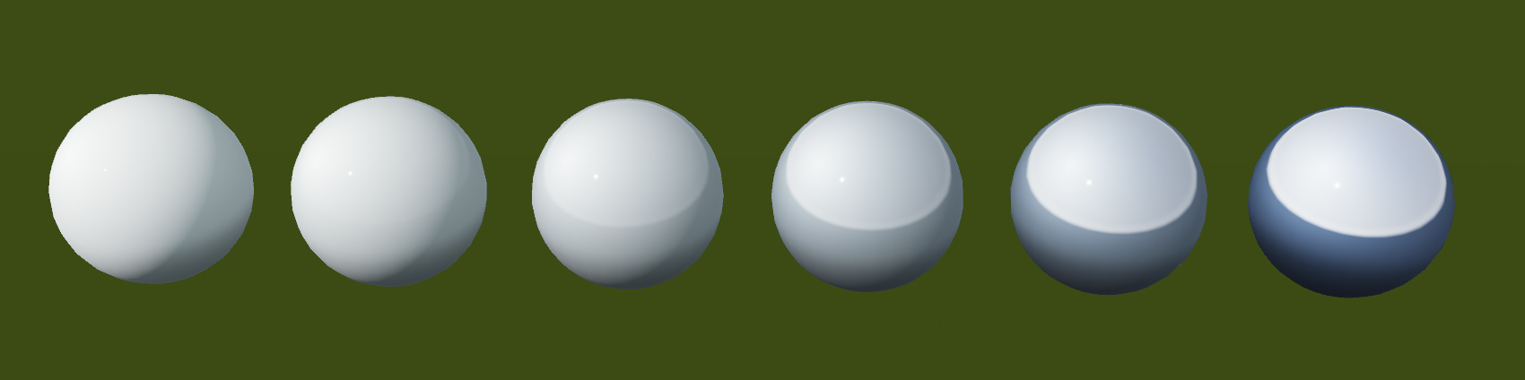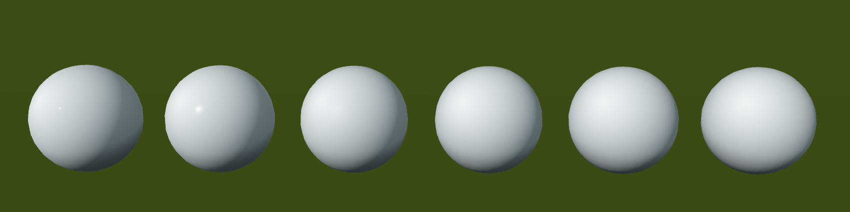 The figure below shows an example of how the roughness effect changes with the roughness value (with metallic at 0, the roughness effect varies; from left to right, roughness values are 0, 0.2, 0.4, 0.6, 0.8, and 1).