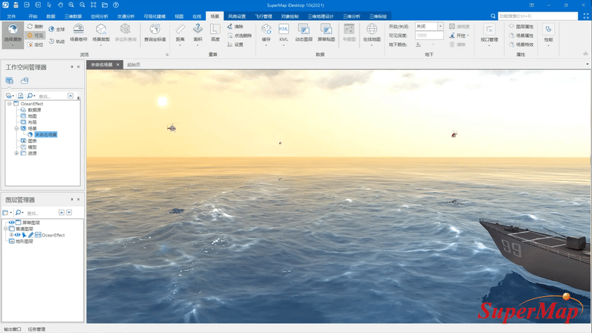 Scene effects refer to the realistic simulation of oceans, skies, etc., in the scene. The realistic simulation of oceans and sky effects has significant application value in fields such as digital twins, military defense, maritime simulation, and aerospace simulation.