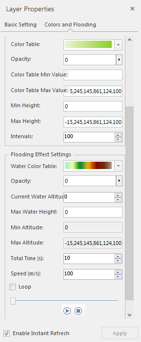 - Speed (m/s): used to display and set the speed of the water body from the minimum elevation to the maximum water level, in m/s. Adjust the speed and the total time will change.