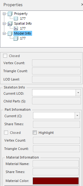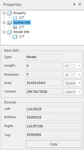 Select the Model Dataest object in the scene, right-click, and select the Properties command in the pop-up Context Menu to pop up the Properties panel. The detailed Attributes of the selected Model Object are displayed in the Attributes panel, including the Object Properties ", Spatial Info", and Model Info "of the Model Object. Click the corresponding tab to view the Model Object information of different categories.