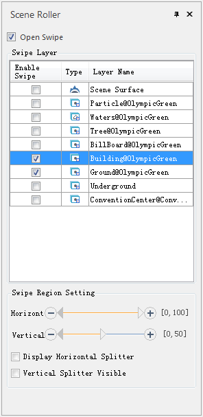 Swipe Layer: Lists the All Layers loaded in the current scene. Check the box to indicate the roller shutter effect for Layer Settings.