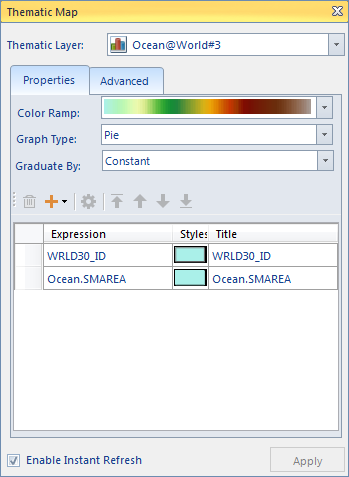 The Parameter Settings - in the Statistical Thematic Map "window will be reflected to the corresponding thematic map layer in the current scene in real time, that is, what you see is what you get. You can also disable Enable Real-time Refresh by unchecking the Enable Instant Refresh "checkbox at the bottom of the dialog box. If the "Enable Instant Refresh" "check box is not checked, the user can click the" Apply "button at the bottom of the dialog box to apply the Parameter Settings in the dialog box to the current thematic map after completing the Parameter Settings.