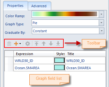 on the toolbar in the middle of the Properties tab allow you to add or remove Statistic Fields to the current Statistical Thematic Map. The current Statistical Thematic Map will be re-graphed in real time according to the modified Thematic variable, and the Display Effects will be refreshed. - Statistical Chart Style Settings: Use the Style Settings button in the toolbar in the middle of the "Properties" tab, or click the Style Settings button in each field in the field list, to set the style of the statistical chart.