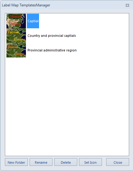The Template Manager is used to uniformly manage the Thematic Map Template preset by the system and the templates of User Custom, so as to facilitate the reuse of Thematic Map Template.