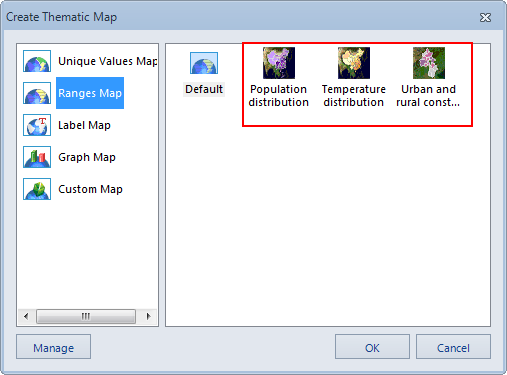 The options in the list on the right side of the Create Thematic Map function interface, except the Default option, are based on the existing 3D Ranges Map template to create a 3D Ranges Map for a 3D layer of Vector Dataset type.