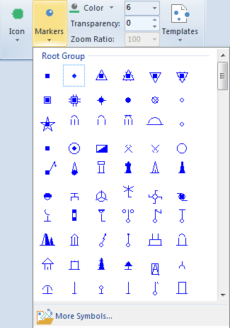 - Click the Symbols drop-down button in the Point Style group on the Styles tab to pop up the point symbol resource list as shown below. The upper part displays user recent symbols, and the lower part provides the system default root group symbol library. Users can select symbols from the list as the symbol style for point objects in the current point layer.