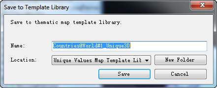 - You can also click the New Folder "button to Create New FolderSave as thematic map template. Click the "Save" button to close the current dialog box and complete the saving of the Thematic Map Template library. The new template library is stored in the subfolder of the corresponding Themtic Type under the "Installation Directory \ Templates \ Theme3D \".