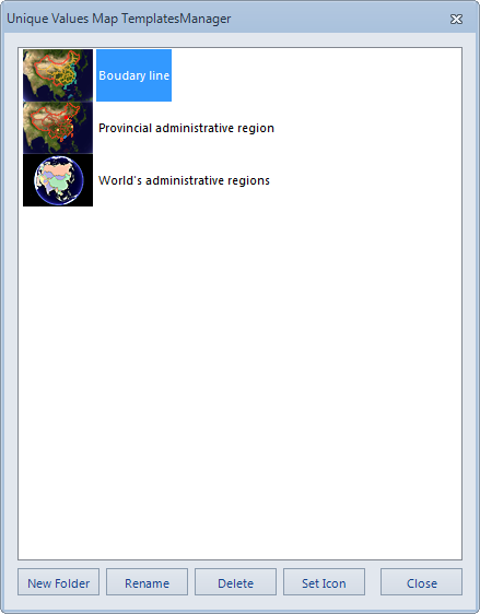 The Template Manager is used to uniformly manage the Thematic Map Template preset by the system and the templates of User Custom, so as to facilitate the reuse of Thematic Map Template.